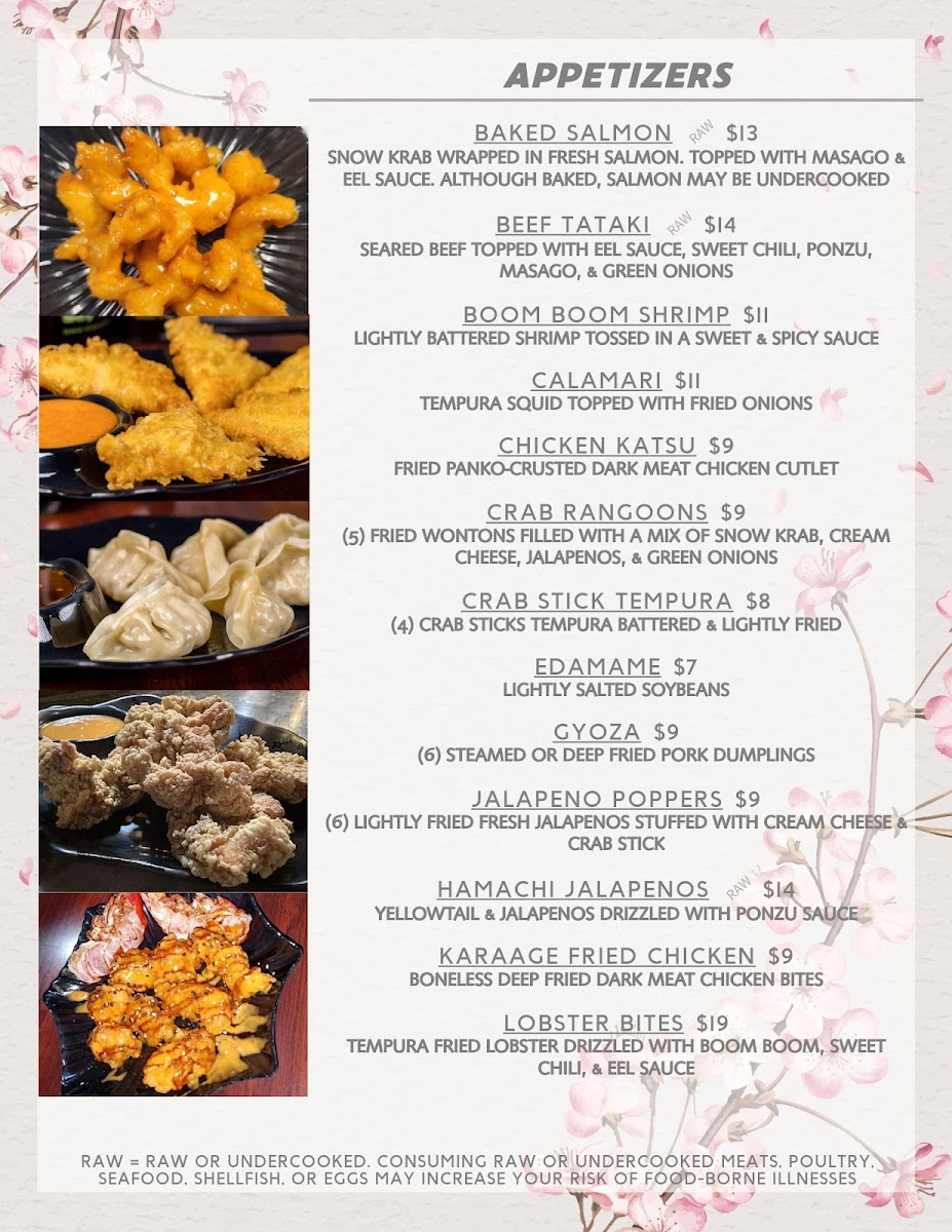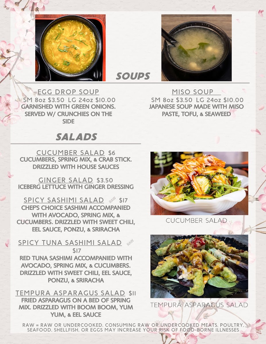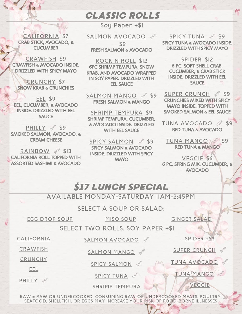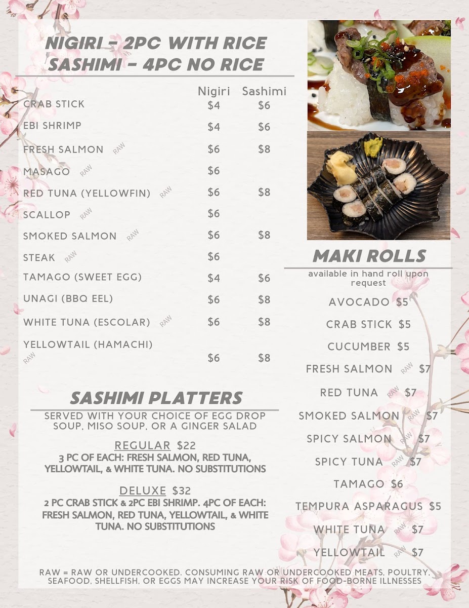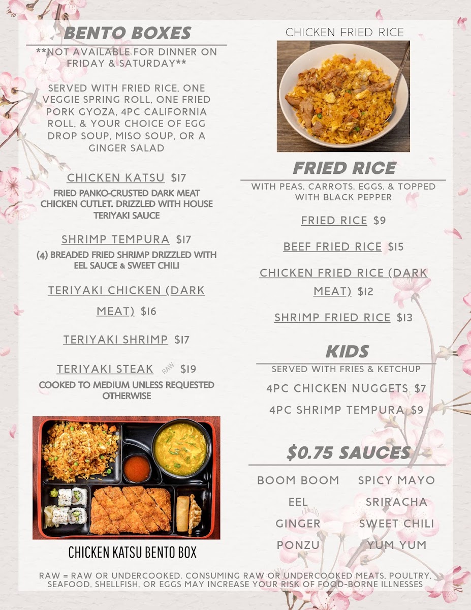 Steak cooked to medium unless otherwise noted. Served raw or undercooked. Consuming raw or undercooked meats, poultry, seafood, shellfish, or eggs may increase your risk of food-borne illness. Available all day Monday-Thursday & LUNCH ONLY Friday-Saturday. Served with fried rice, your choice of soup or salad, one veggie spring roll, 4 pieces California roll, and one fried pork gyoza.