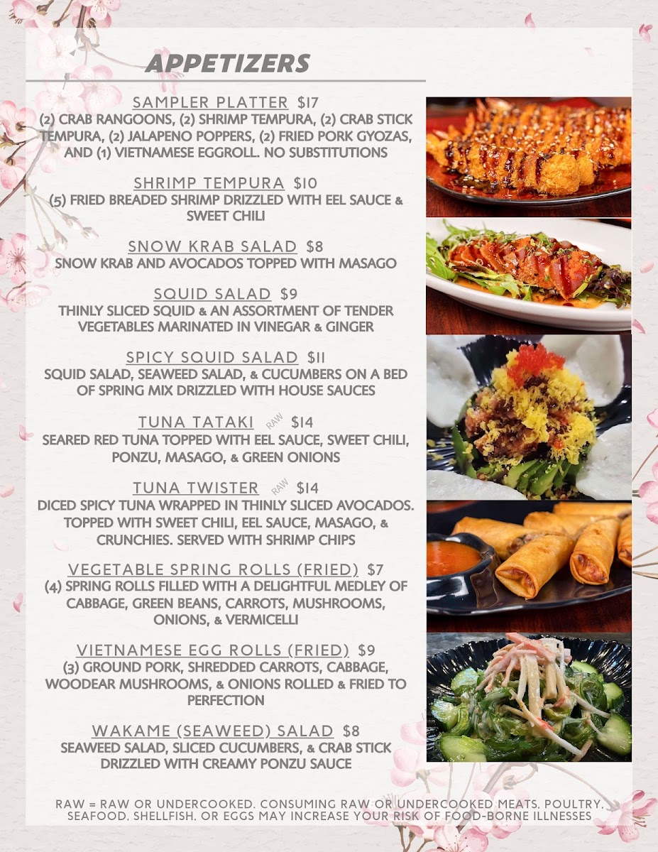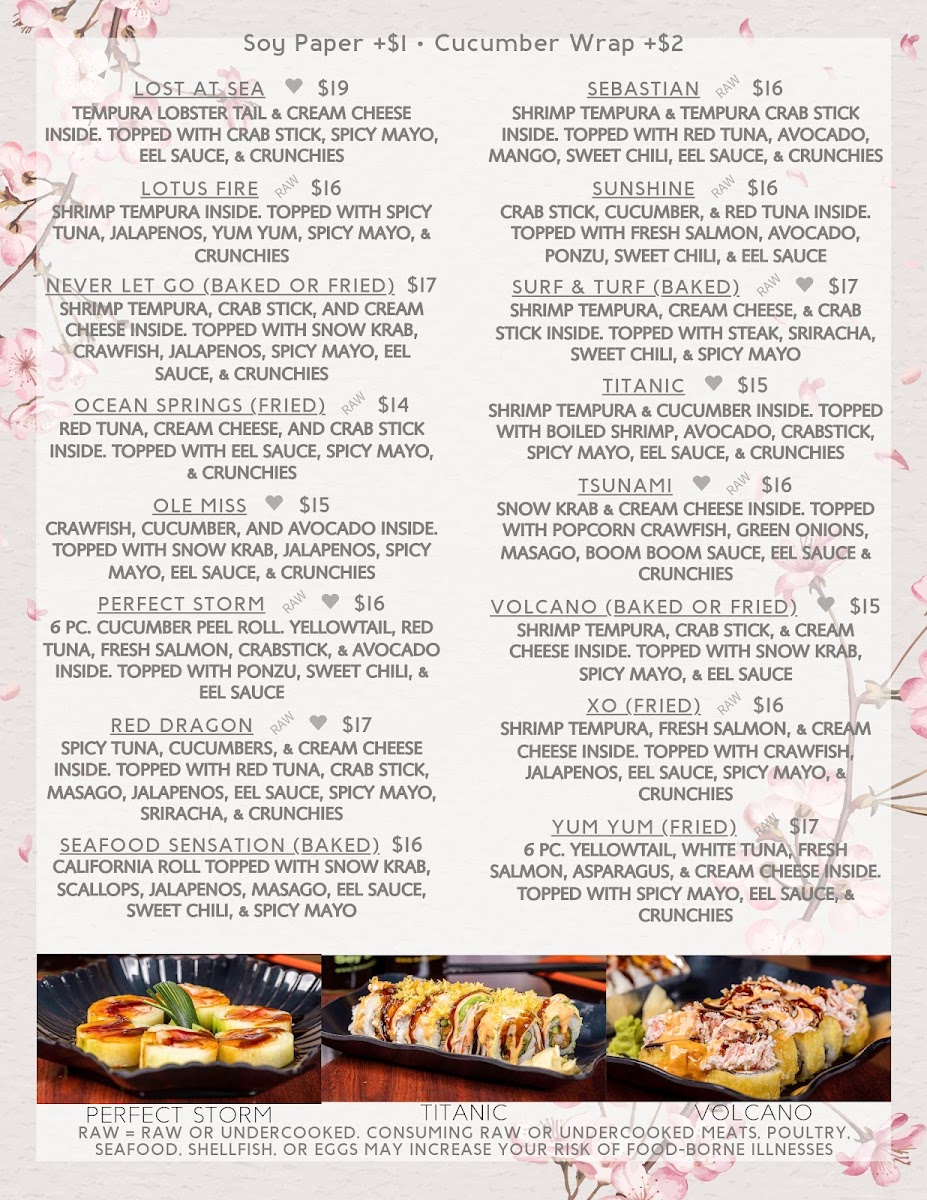 Shrimp tempura, cream cheese, and crab stick inside. Topped with steak, sriracha, sweet chili, and spicy mayo. *Served raw or undercooked. Consuming raw or undercooked meats, poultry, seafood, shellfish, or eggs may increase your risk of food-borne illness.