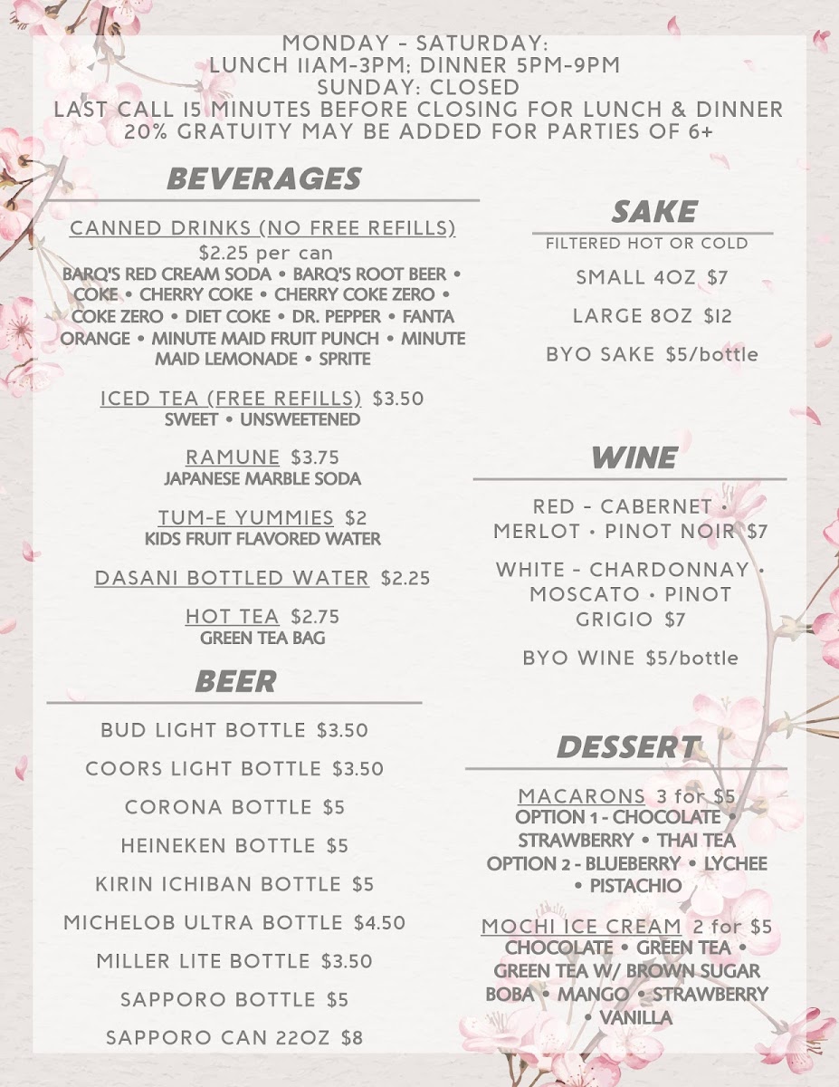 As a reviewer, I find the menu at Hatsukoi Restaurant & Sushi Bar to be a well-rounded reflection of Japanese comfort food and sushi craftsmanship, offering something for every type of diner. The experience can start lightly with Large Egg Drop Soup (24oz), Large Miso Soup (24oz), or Small Miso Soup (8oz), paired nicely with fresh options like Cucumber Salad or the flavorful Spicy Tuna Sashimi Salad. For guests seeking a complete and satisfying meal, the bento selections such as Shrimp Tempura Bento Box, Teriyaki Shrimp Bento Box, Teriyaki Chicken (Dark Meat) Bento Box, Teriyaki Steak Bento Box, and Chicken Katsu Bento Box deliver variety and balance in one tray. Sushi lovers will appreciate the creativity of the signature rolls, including Dancing Eel, Blossom, Lost At Sea, Seafood Sensation (Baked), and Sunshine, while traditional tastes are well represented with classic rolls like Salmon Avocado Roll, Salmon Mango Roll, Rainbow Roll, Crunchy Roll, and Spider Roll. The menu also highlights quality seafood through Regular Sashimi Platter, Deluxe Sashimi Platter, and nigiri selections such as Fresh Salmon, Scallop Nigiri, Ebi Shrimp, Crab Stick, and Tamago (Sweet Egg). Warm and hearty choices like Chicken Fried Rice (Dark Meat), Beef Fried Rice, Shrimp Fried Rice, Chicken Yaki Udon, Shrimp Yaki Udon, Yakisoba, and comforting bowls of Beef Pho, Combination Pho, Shrimp Pho, or Meatball Pho further showcase the kitchen’s versatility. Families are also thoughtfully considered with kid-friendly options like Kids Shrimp Tempura (4 Pieces), Kids Chicken Tenders (2 Pieces), and Kids Chicken Nuggets (4 Pieces). To round out the experience, appetizers such as Boom Boom Shrimp, Chicken Katsu Appetizer, Crab Stick Tempura, and Sampler Platter, along with sauces like Boom Boom Sauce, Yum Yum Sauce, Eel Sauce, Sweet Chili, and Ginger Dressing, add extra layers of flavor. Overall, the menu feels cohesive, generous, and carefully curated, making Hatsukoi a reliable destination for both casual dining and sushi-focused meals.