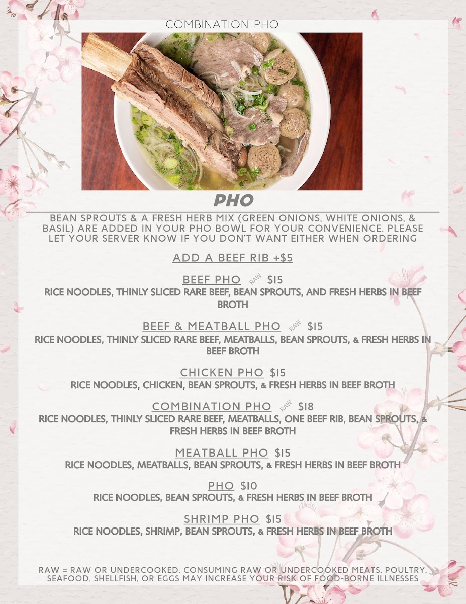 Rice noodles, thinly sliced rare beef, bean sprouts, & fresh herbs (green & white onions,, & basil). Beef broth packaged separately. *Served raw or undercooked. Consuming raw or undercooked meats, poultry, seafood, shellfish, or eggs may increase your risk of food-borne illness.